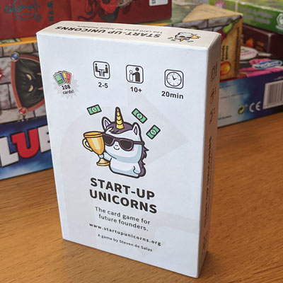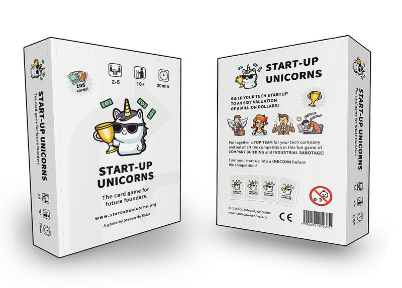 Startup Unicorns! is a 2-5 player "race-to-the-top" card game about founders and startups designed by Steven De Salas.